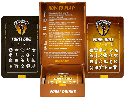 Bring Fore! Cards to your next round and let the fun ensure! Pick cards on each hole to determine how the hole is played and use cards to gain an advantage (or give your opponent a disadvantage)!