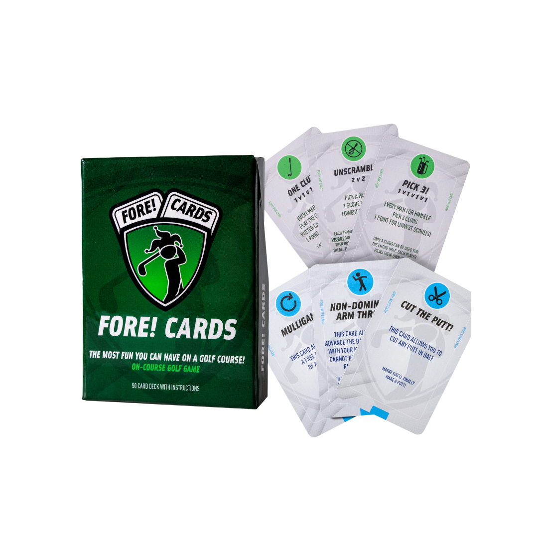 Bring Fore! Cards to your next round and let the fun ensure! Pick cards on each hole to determine how the hole is played and use cards to gain an advantage (or give your opponent a disadvantage)!