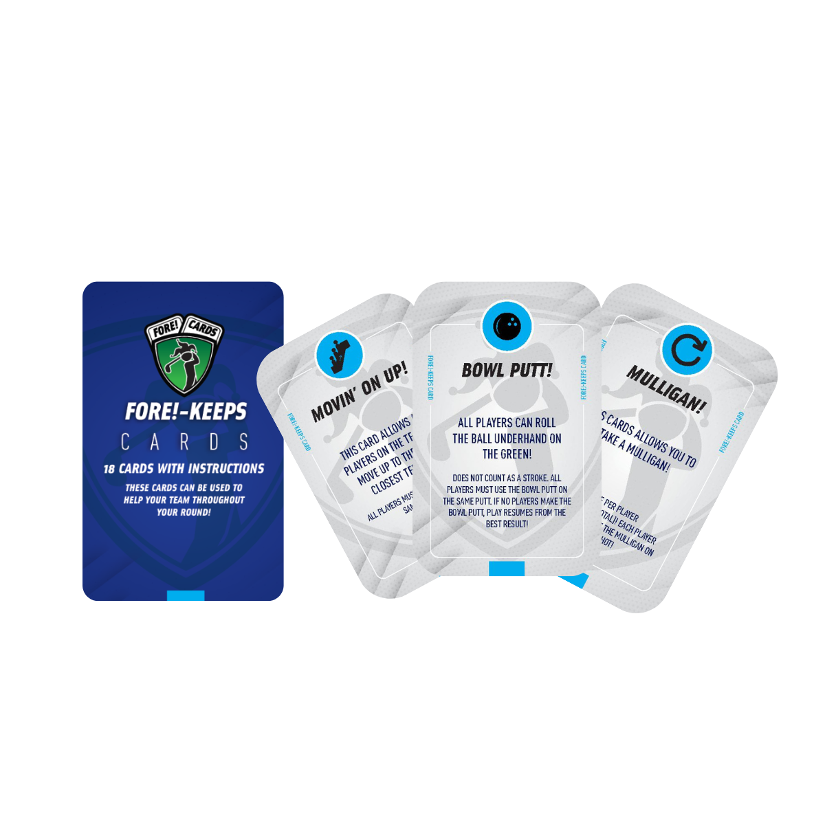 Ditch the traditional mulligans for Fore-Keeps card packs. Each pack contain 15 helpful actions like, being able to throw the ball or teeing it up from anywhere, that teams can use to gain an advantage throughout the event. Drive more revenue by selling the cards before the event.