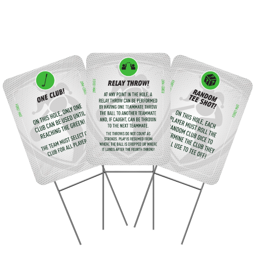 Add a fun and unique twist to your event with Fore-Mat Tee Signs. Each signs present golfers with a fun challenge that will require them to play the hole a bit differently than normal.